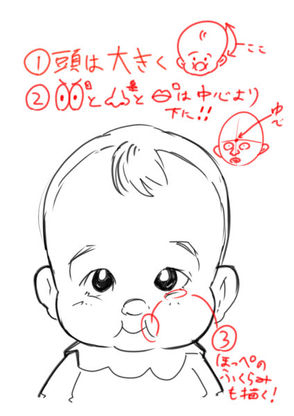 0才〜1才は特に目、鼻、口、のパーツを下に描いてより幼さを出した方が